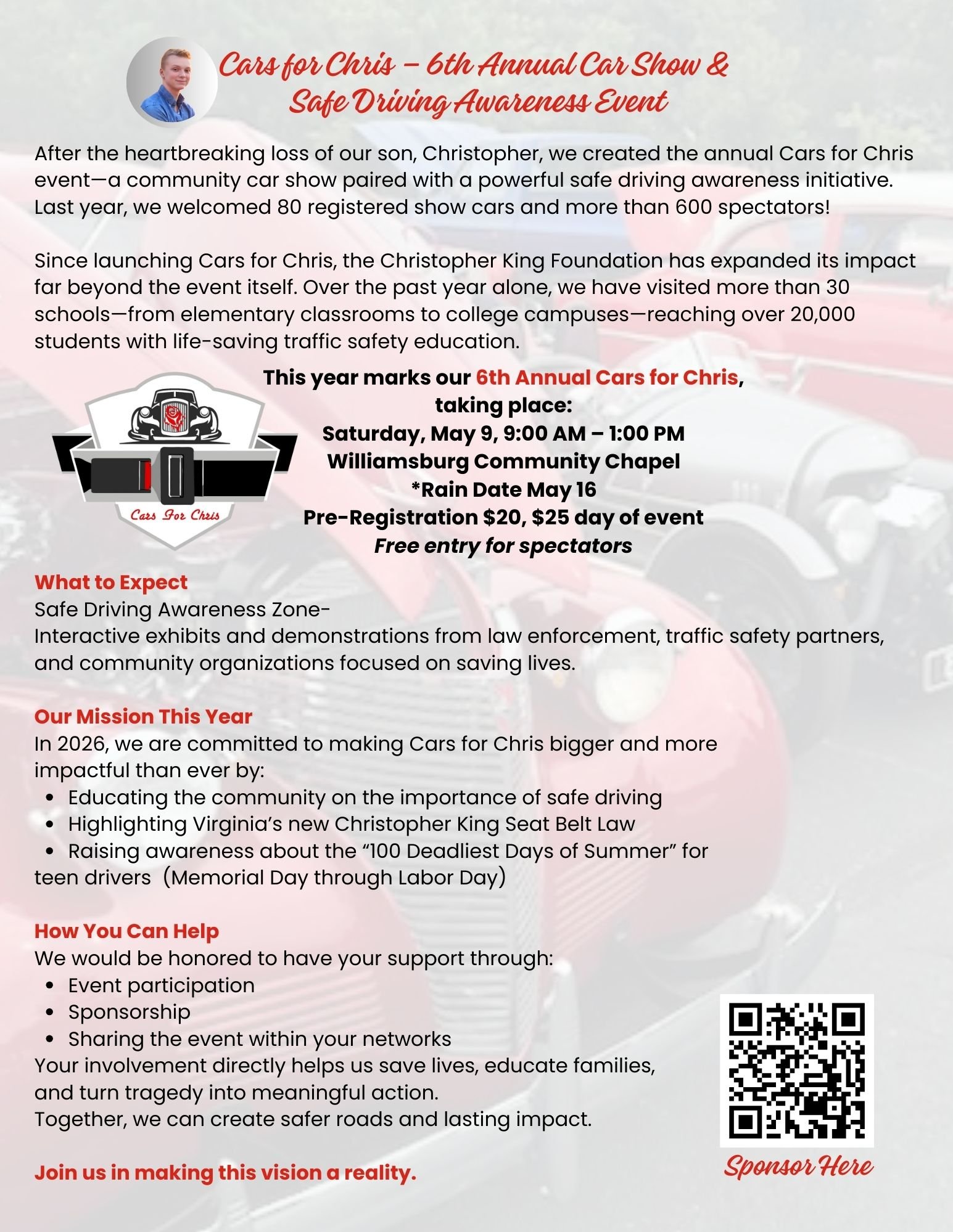 The 6th Annual Cars for Chris Car Show and Safe Driving Event is more than just a fun event—it raises vital funds for the Christopher King Foundation, helping our team speak in schools across the state of Virginia about the importance of seat belt safety.