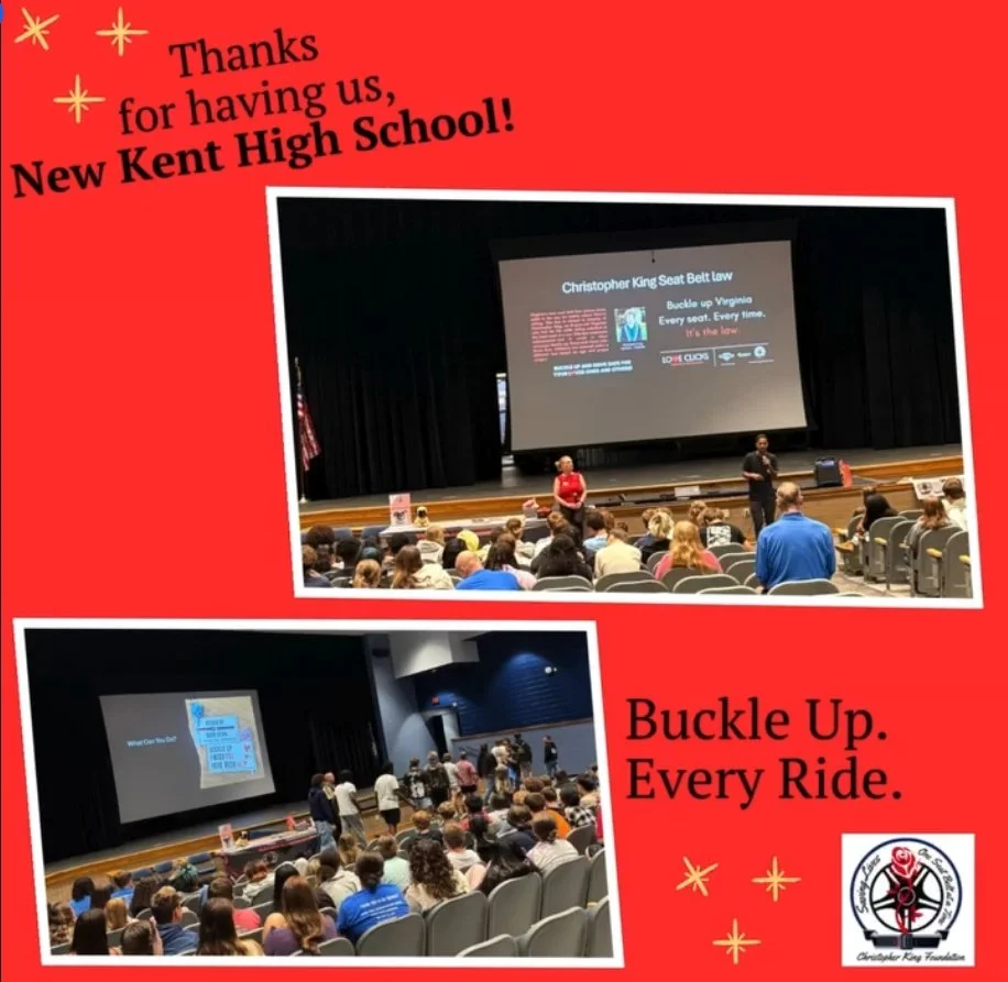 It was great to be with so many students at New Kent High School last Friday! We talked with more than 500 students about seat belt safety, Christopher's story, the new #ChristopherKingSeatBeltLaw, and so many other safe driving tips! New Kent County Public Schools