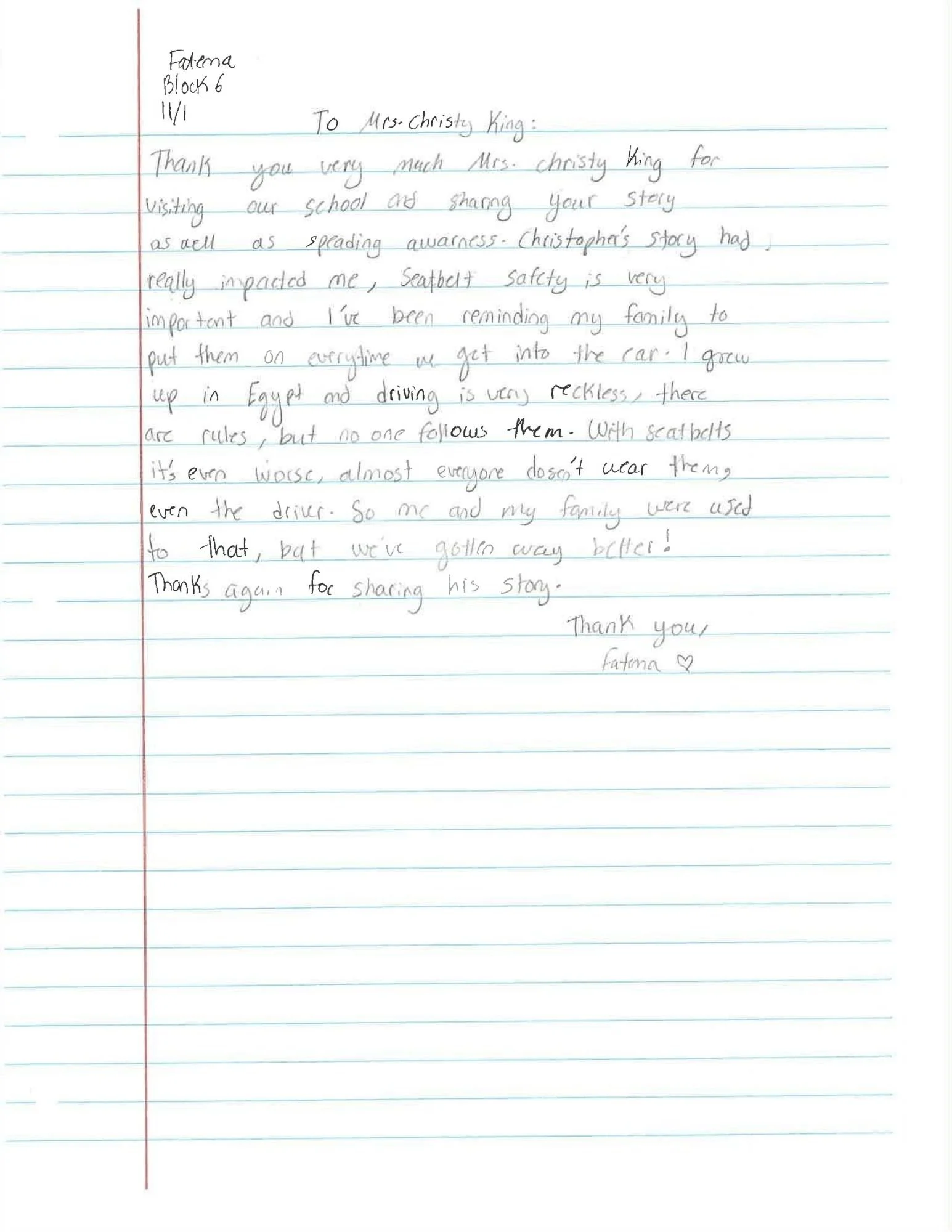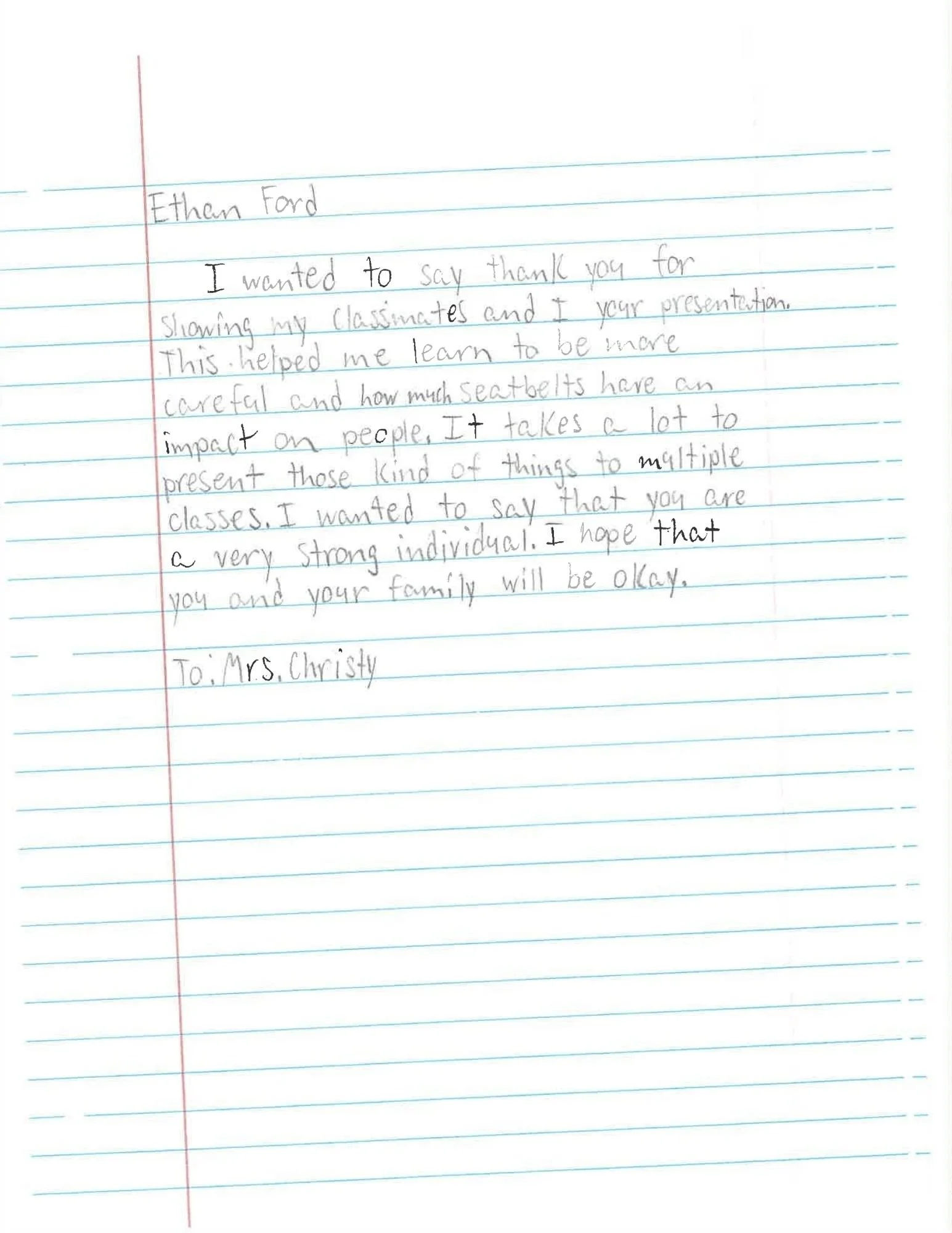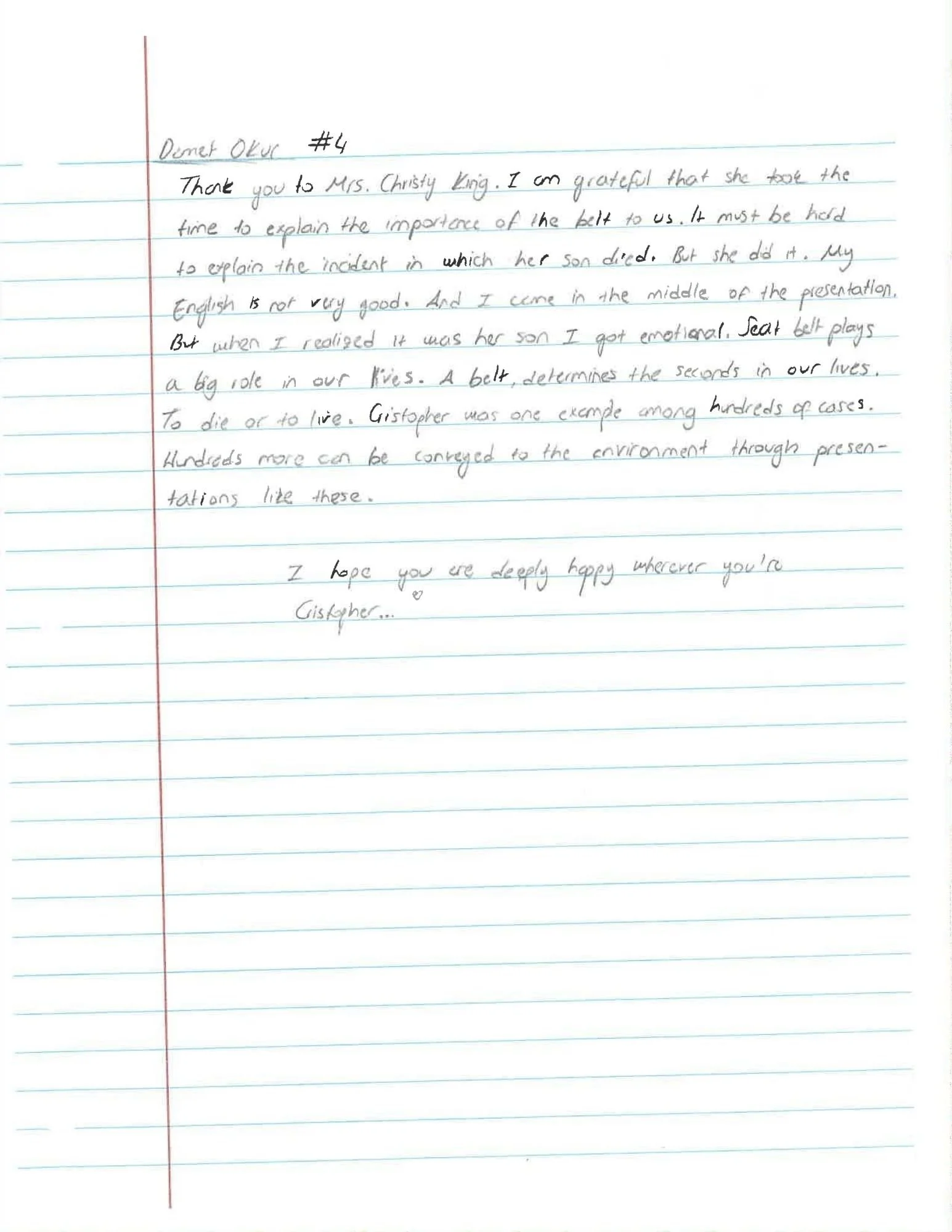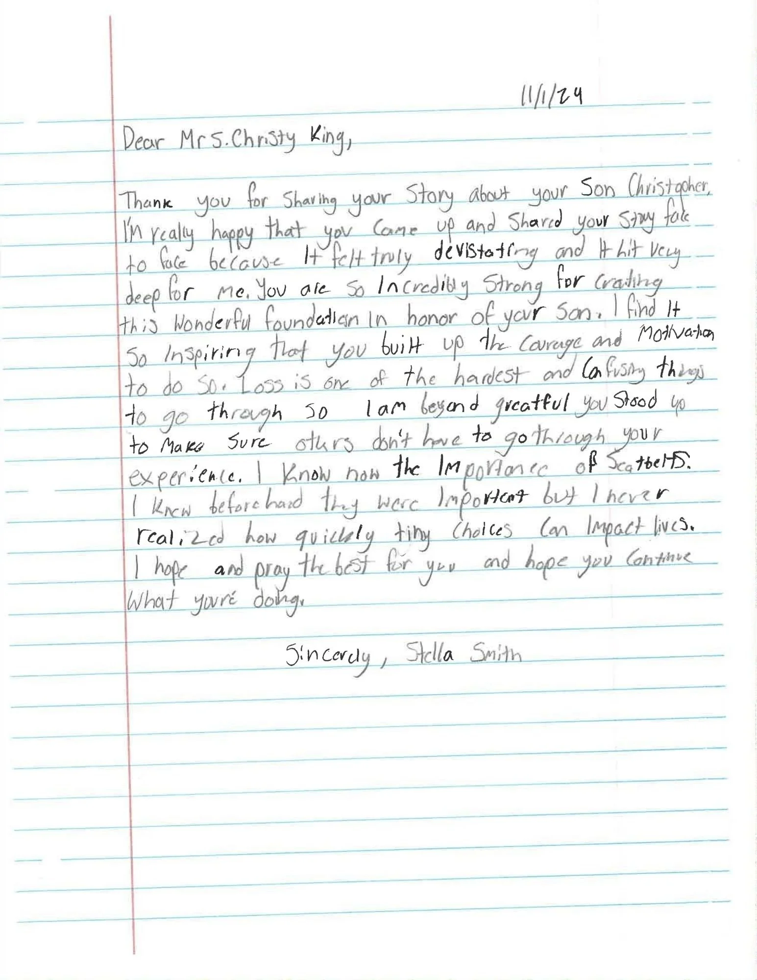 09/26/25 Your foundation visited my daughters school today ( New Kent High School) and it seems like it made a major impact on her. She could not stop talking about the story she heard and how much it impacted Christopher's mom and two best friends. I love what you are doing and wanted to reach out and say thank you. Alyssa will be driving soon and I believe that it is important that she hears stories like Christopher's to understand the dangers of making one wrong decision and how it can result in something so tragic and impact so many people. You guys are amazing. I will say a prayer for your family and all of Christopher's friends.